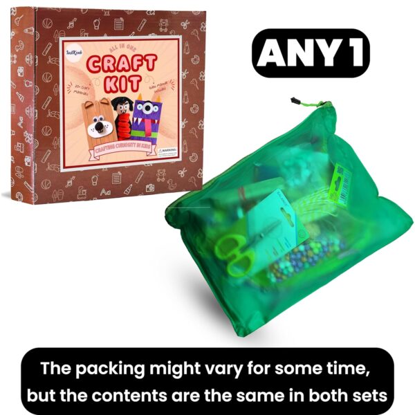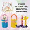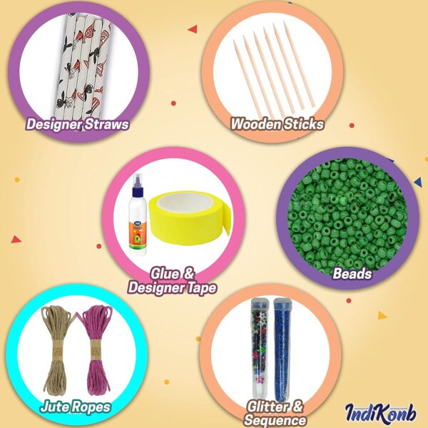 • ? WHAT’S INSIDE ? : Pompom , pipe cleaners , Colored icecream sticks , plain ice cream sticks , designer A5 sheets , glue , scissors , glitter , sequins , paper thread , jute rope , colored thread , colorful beads , googly eyes , paints and brush , bamboo sticks , mirrors , foam flowers , paper straw , sketch pens , and DIY manual !