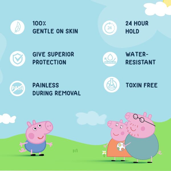 - NON-TOXIC – Our fun colorful peppa pig plasters are tough on germs, gentle on your wound and skin. Made with non-toxic breathable, lightweight and flexible quality material, these first aid strips help in healing minor cuts, scrapes, burns, blisters and more!