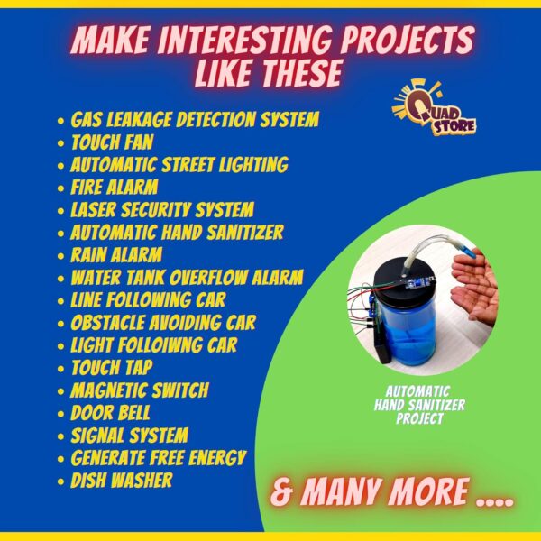 - Build interesting projects like Bugler alarm, Laser Security system, overhead tank alarm, line following car, Obstacle avoiding car, automatic water tap etc.