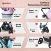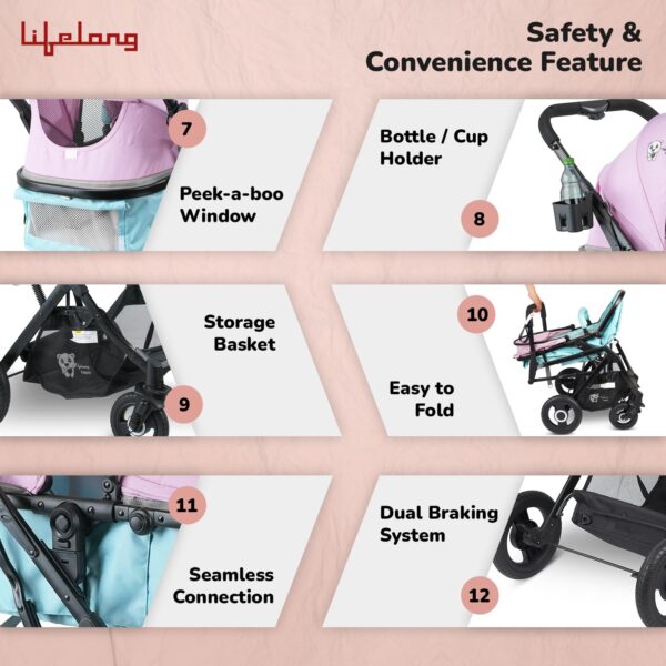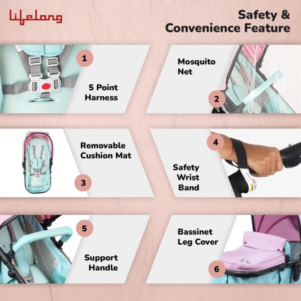 - Enhanced Comfort and Safety: Airflow feature for ventilation, 5-point harness for security, peek-a-boo window for monitoring, storage basket for convenience, and support handle for stability.