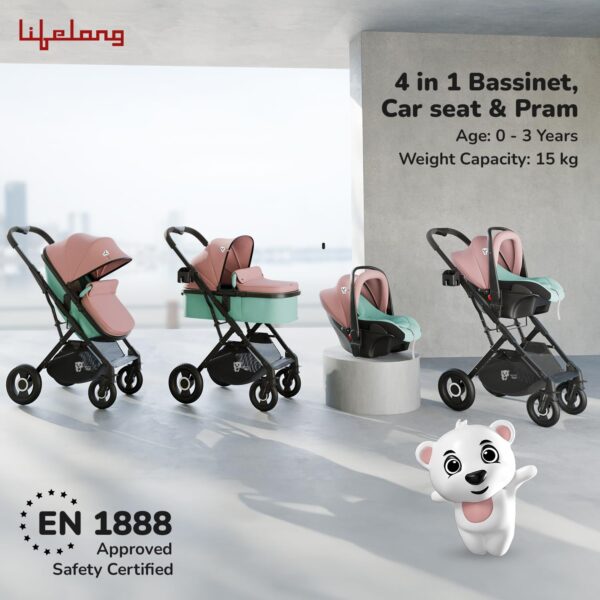 - 4 in 1 Reversible Bassinet, Car Seat, Pram, Carry Cot: This versatile travel system is perfect for infants up to 3 year old or 15 kg. It’s EN1888 certified, ensuring top-notch safety standards. The reversible bassinet can be easily transformed into a car seat or pram, offering flexibility for parents on the go.